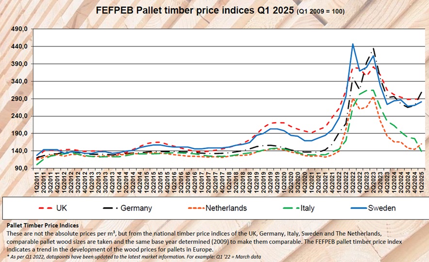 The FEFPEB European Pallet timber price indices are an overview of five different price indices compiled by the national pallet and packaging manufacturers’ associations and verified by independent bodies. These are not the absolute prices per m3, but from the indices of the UK, Germany, Italy, Sweden and the Netherlands. Comparable pallet wood sizes are taken and given the same base year to show the trend in the development European prices.