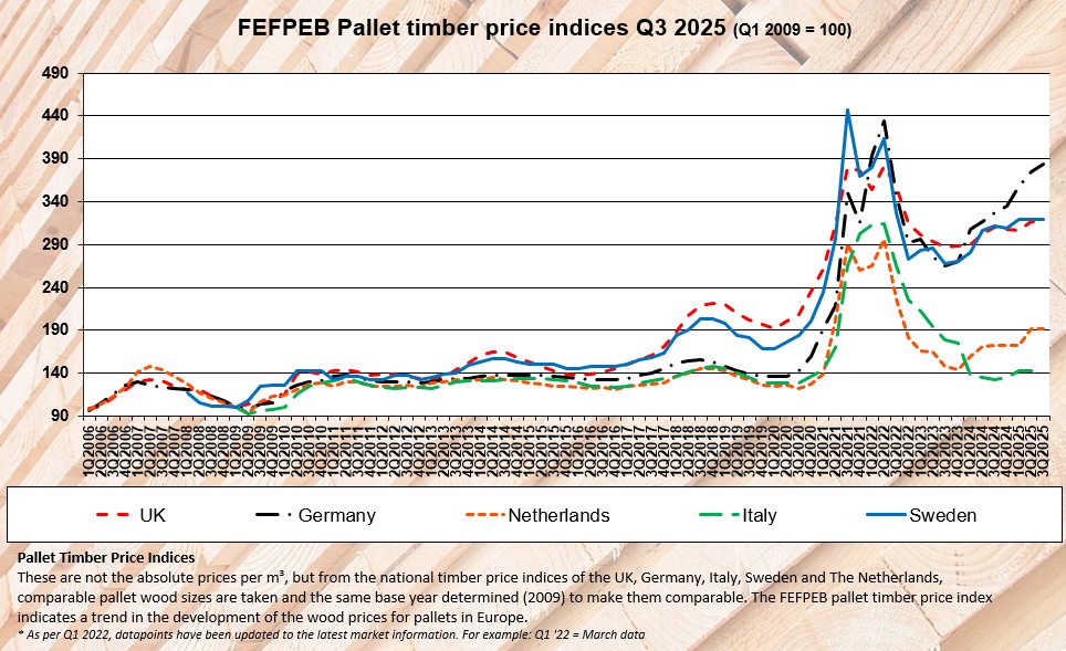 The FEFPEB European Pallet timber price indices are an overview of five different price indices compiled by the national pallet and packaging manufacturers’ associations and verified by independent bodies. These are not the absolute prices per m3, but from the indices of the UK, Germany, Italy, Sweden and the Netherlands. Comparable pallet wood sizes are taken and given the same base year to show the trend in the development European prices.